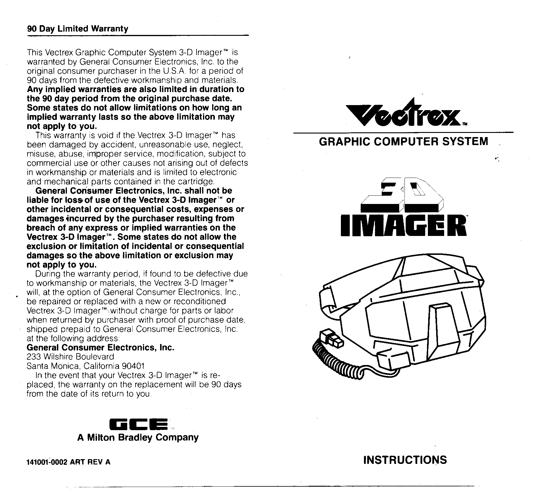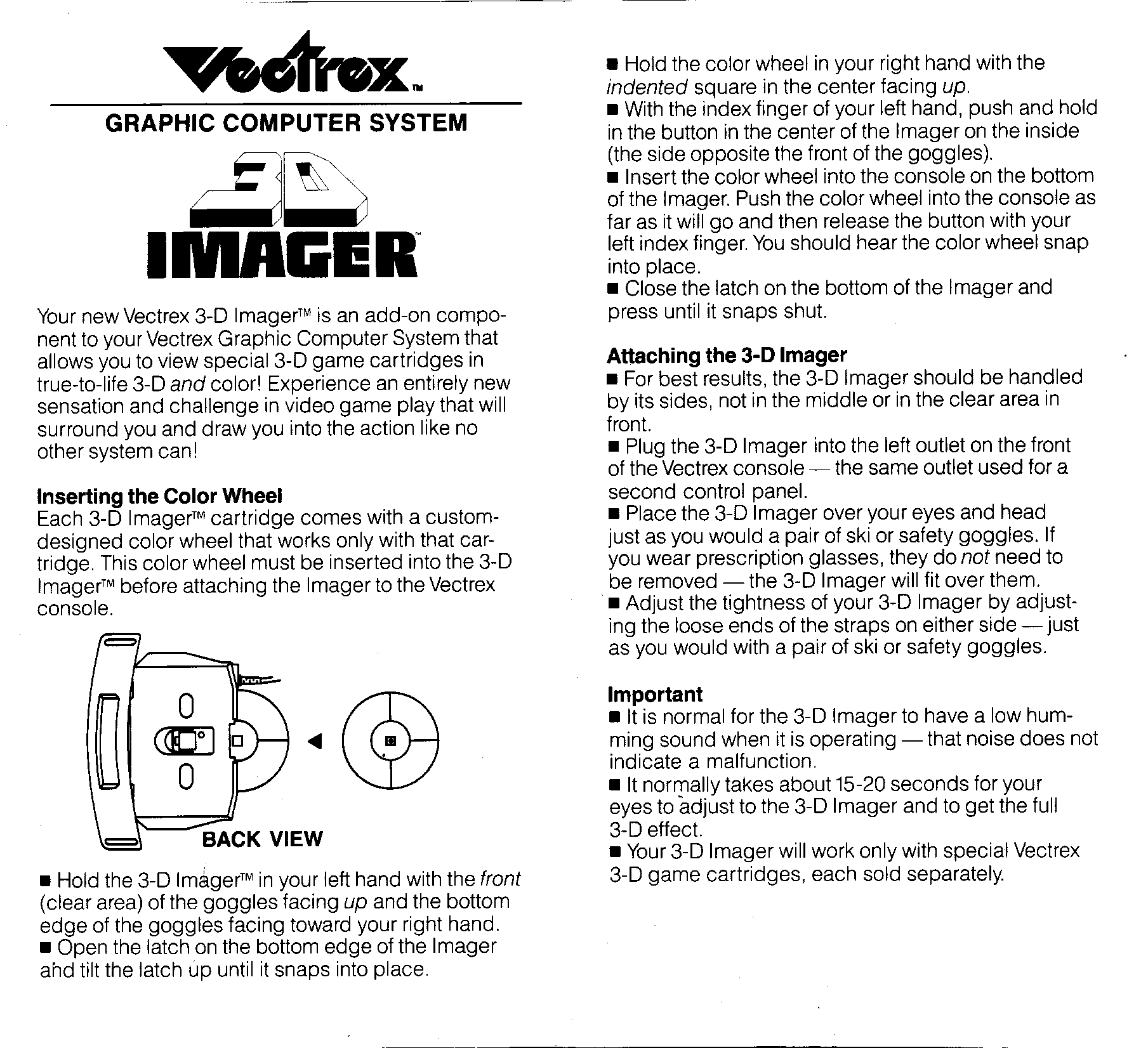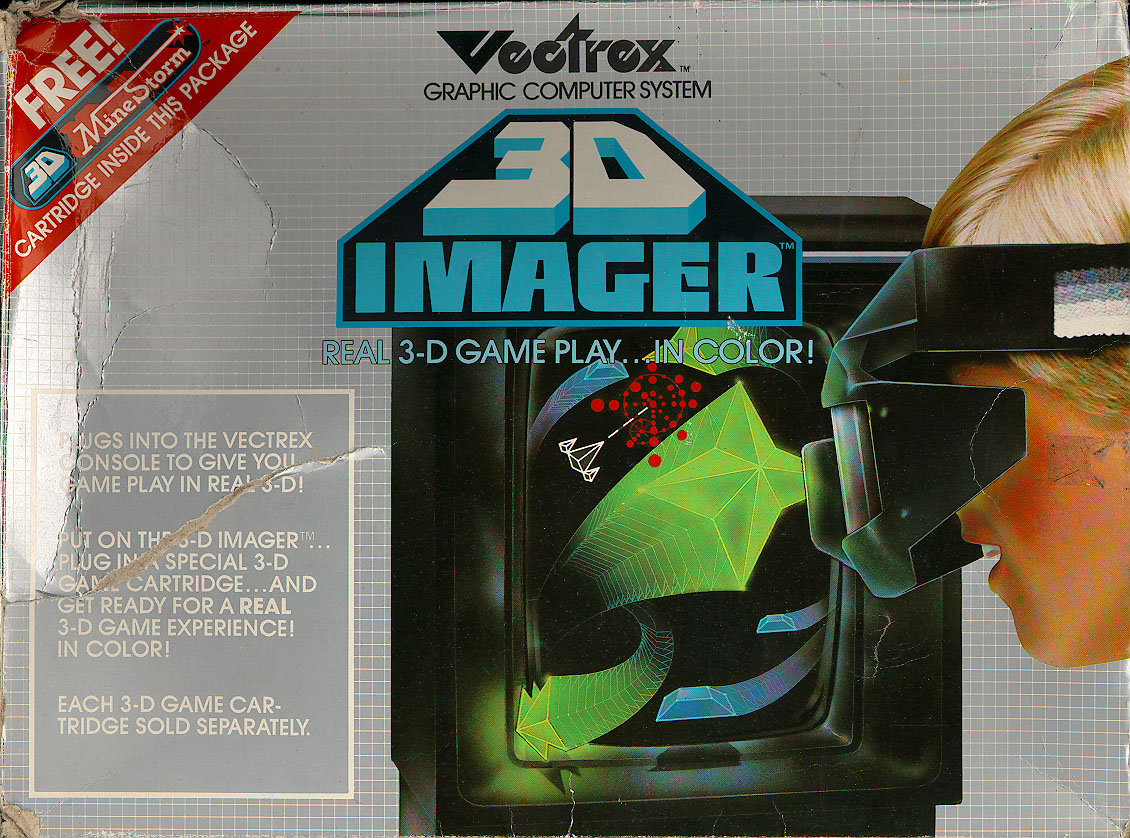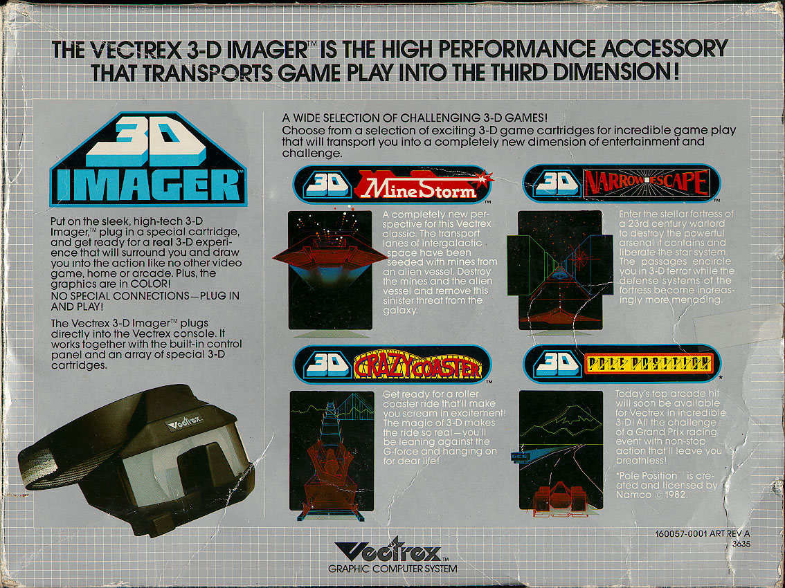 The 3d imager is a rather funky looking set of 3D glasses for the Vectrex. There were three titles released for the unit, 3D Minestorm (included with the imager), Crazy Coaster and Narrow Escape. 3D Pole Position is rumoured to have been completed but was never released.