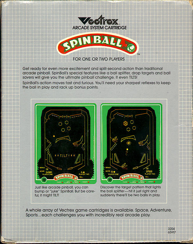 Spinball is a pinball simulation which is mildly fun to play. While the ball movement and general mechanics of the game seem very poor in comparison to todays pinball games, it is still a huge improvement over similar games released at the time (Video Pinball on the 2600 is the biggest pile of pants i've ever seen). Overall a game that was way ahead of it's time but is definately showing it's age. |